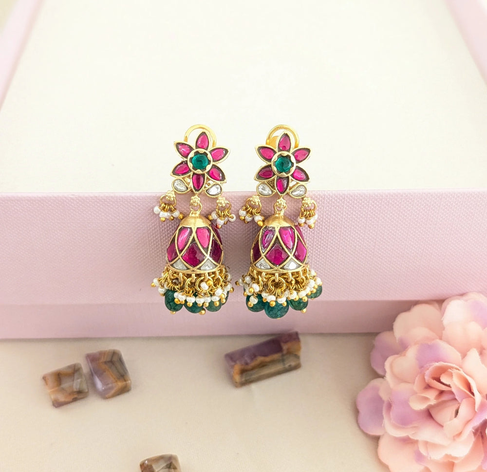 Add a touch of delicate elegance to your jewellery collection with these charming Jadau Kundan floral jhumkas. The top features a beautifully crafted floral motif adorned with vibrant Kundan stones in rich ruby tones and subtle green accents.