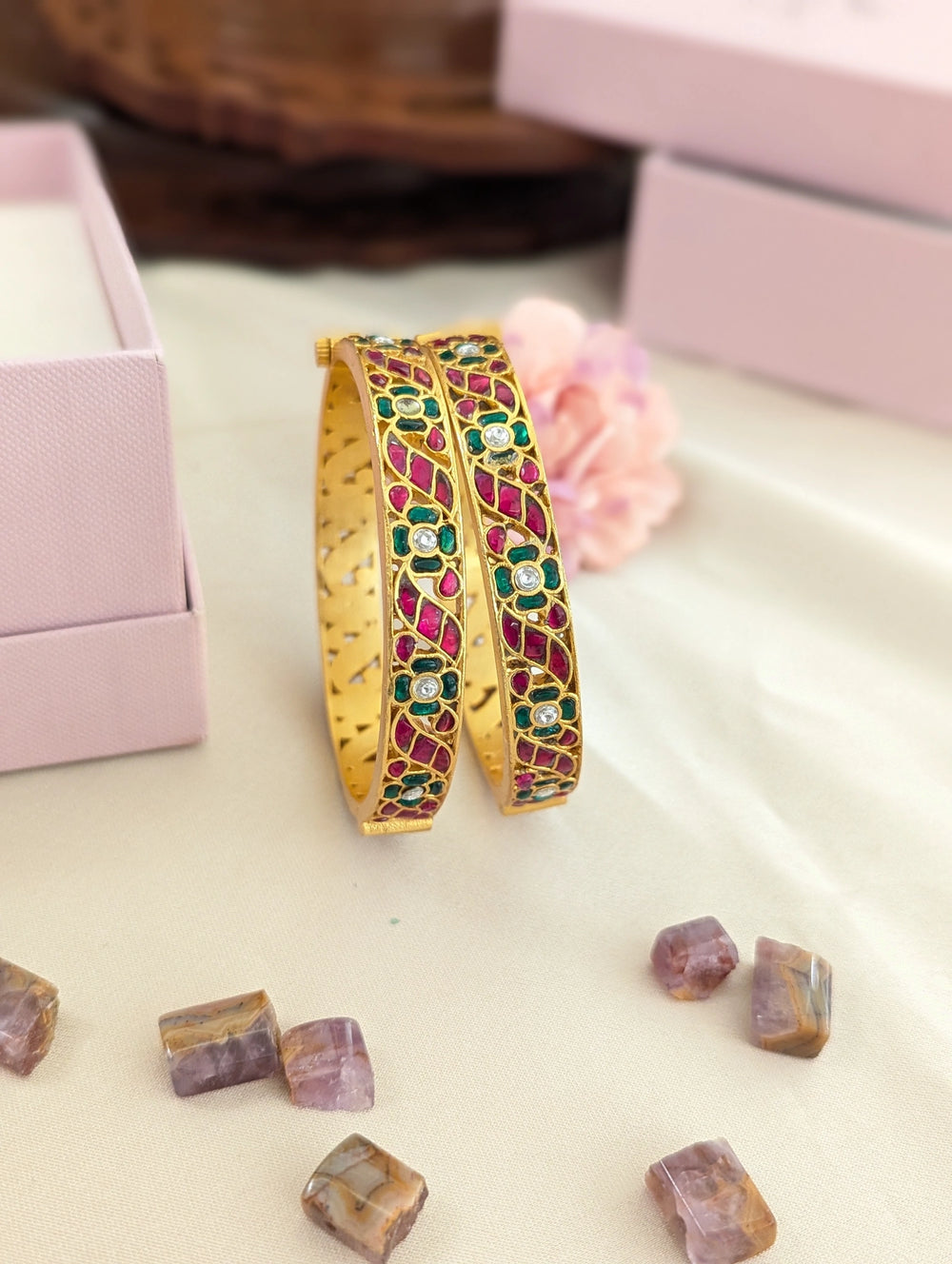 Designed for comfortable everyday wear as well as special occasions, these bangles pair effortlessly with sarees, lehengas, and ethnic outfits. Their classic silhouette and balanced colour palette make them versatile additions to any traditional jewellery collection.