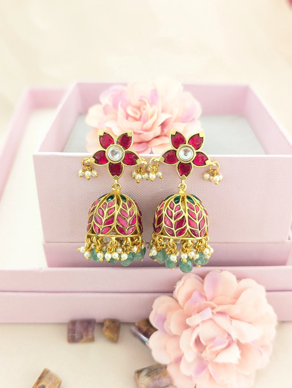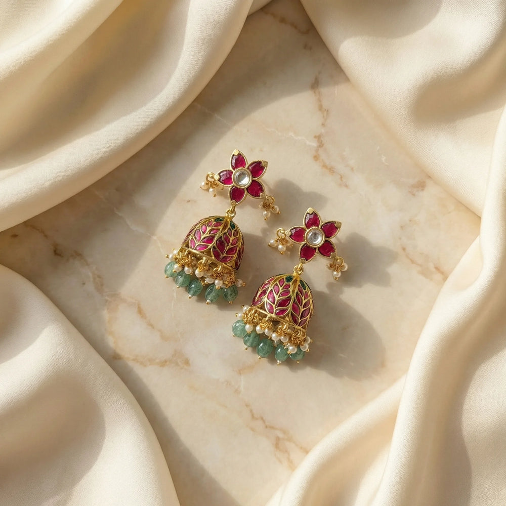 Grace your festive look with these exquisitely handcrafted Jadau Kundan floral jhumkas. The elegant flower-shaped studs are adorned with deep ruby-toned stones and a sparkling kundan center, creating a rich and refined aesthetic.