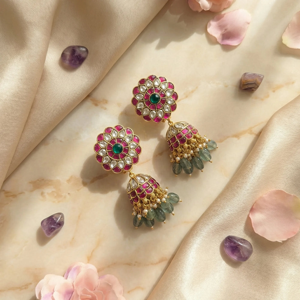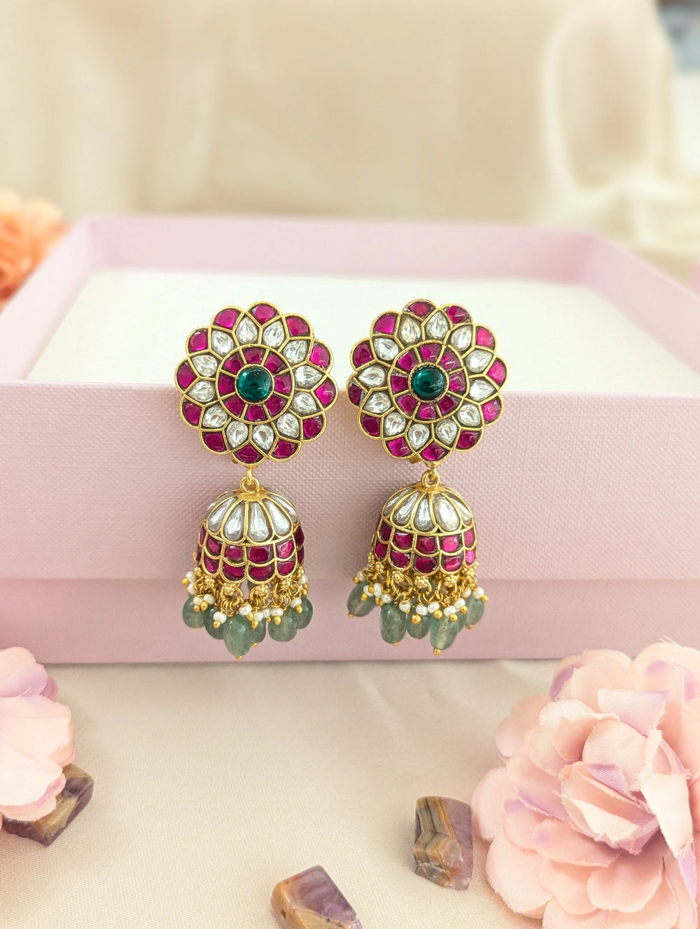 These Jadau Kundan Floral Jhumkas are a graceful blend of traditional artistry and timeless elegance. Designed with a beautifully detailed floral stud, each piece is set with kundan-style stones in rich ruby tones and highlighted by a subtle green centre, creating a classic and balanced look. The floral top flows into a delicately crafted jhumka dome, adding depth and traditional charm.