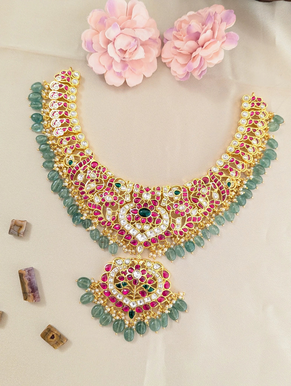 An exquisite celebration of traditional artistry, this Jadau Kundan floral necklace is designed to create a grand yet graceful statement. The neckline is richly adorned with intricate floral motifs set in vibrant ruby-toned and white kundan stones, highlighted with subtle green accents for added depth.
