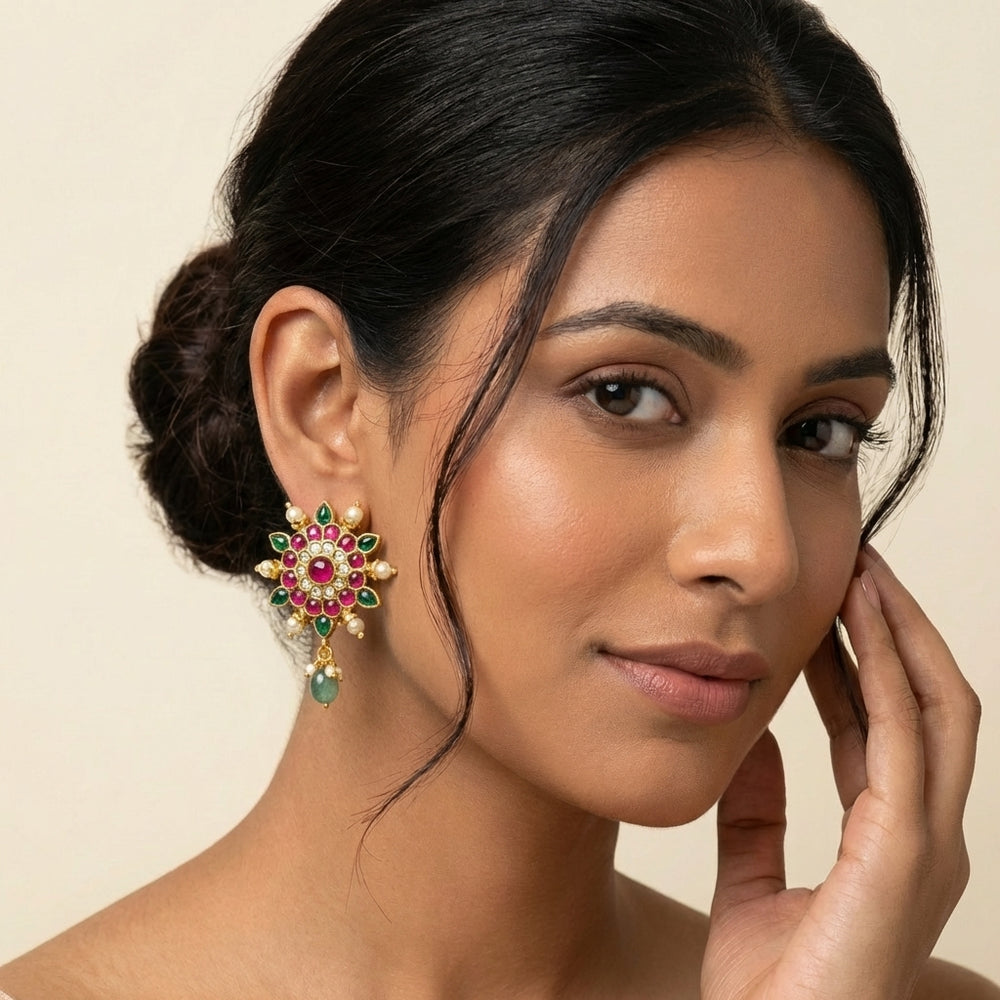 Add a touch of elegance to your everyday ethnic look with these beautifully crafted Jadau Kundan floral stud earrings. Designed in a radiant floral pattern, the studs feature finely set Kundan stones with vibrant ruby tones and subtle green accents for a rich, festive appeal.