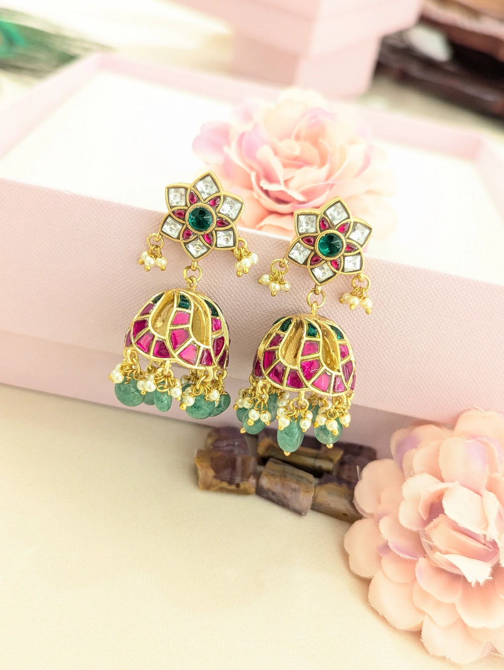 Jadau Kundan Jhumkas with Pearl & Natural Strawberry Beads