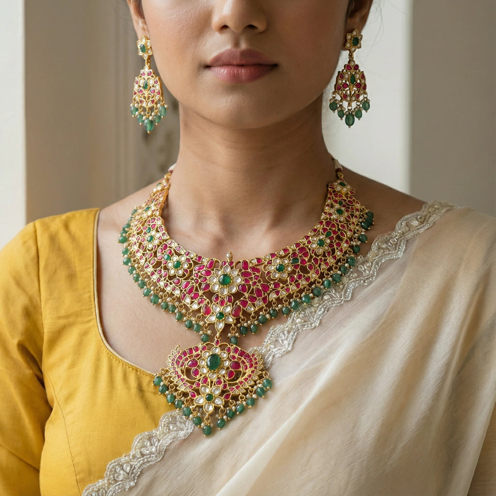 This Jadau Kundan Necklace Set is a timeless blend of traditional craftsmanship and refined elegance. Designed in a classic gold-tone framework, the necklace is intricately hand-set with kundan-style stones in rich ruby hues, highlighted by soft green accents that add depth and contrast. Delicate bead detailing along the lower edge enhances the overall silhouette, giving the piece a graceful, finished look.