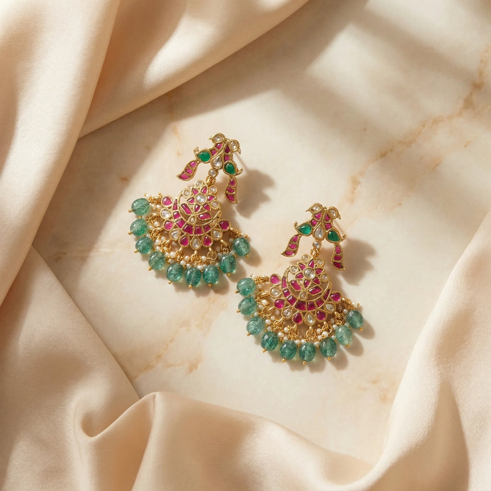These Jadau Kundan Peacock Drop Earrings are a striking blend of traditional elegance and intricate craftsmanship. Designed with a beautifully detailed peacock-inspired top, the earrings feature rich ruby-toned kundan stones highlighted with subtle green accents that enhance the regal motif. The ornate central design flows gracefully into a layered drop, creating a bold yet balanced silhouette.