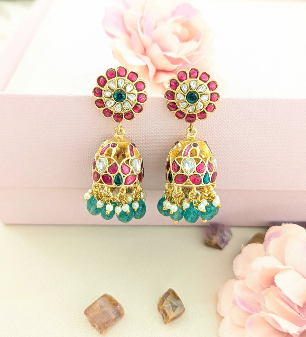 Designed to capture traditional elegance, these Jadau Kundan Peacock Jhumkas are a perfect blend of vibrant colour and intricate craftsmanship. The round floral stud features rich pink kundan stones encircling a striking green centre, creating a bold yet graceful statement.