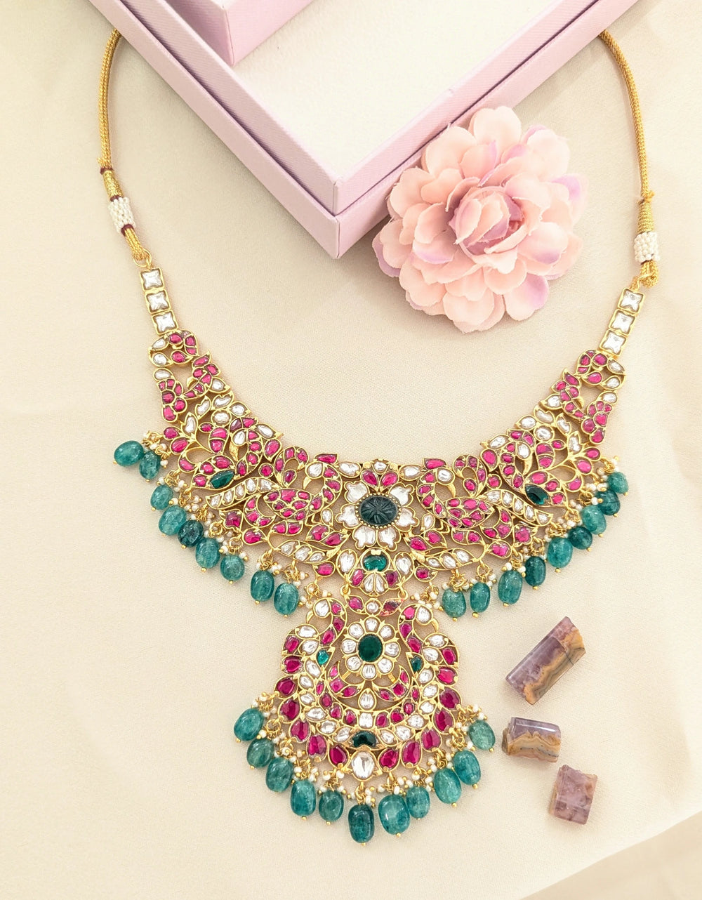Jadau Kundan Peacock Necklace (No Earrings)With Center Carving Stone, Pearls & Natural Strawberry Beads DropPrice: ₹8000 Elevate...