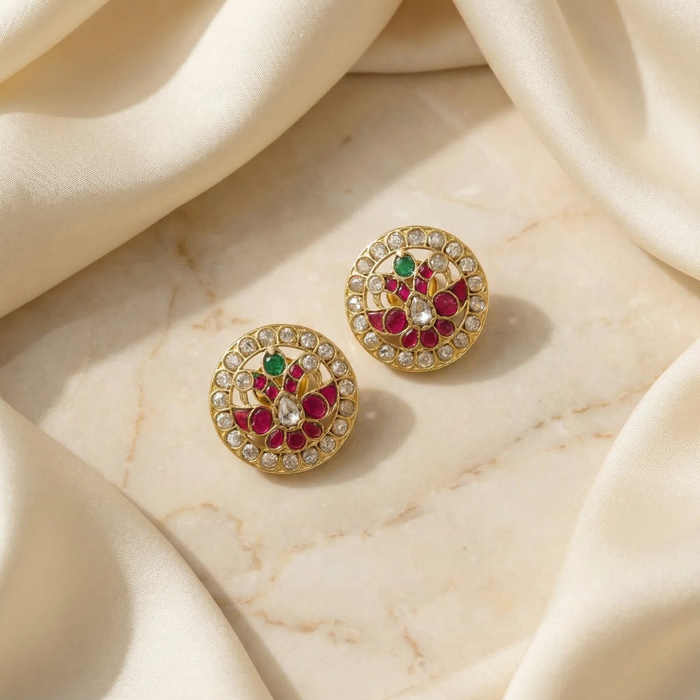 These Peacock Jadau Kundan Stud Earrings are a graceful tribute to traditional Indian artistry, featuring a beautifully detailed peacock motif at the center. Crafted in a classic round silhouette, the design is highlighted with kundan-style stones in rich ruby tones, complemented by a subtle green accent that brings the peacock form to life. A delicate ring of clear stones surrounds the motif, enhancing brilliance and definition, while the gold-tone finish adds a regal touch.