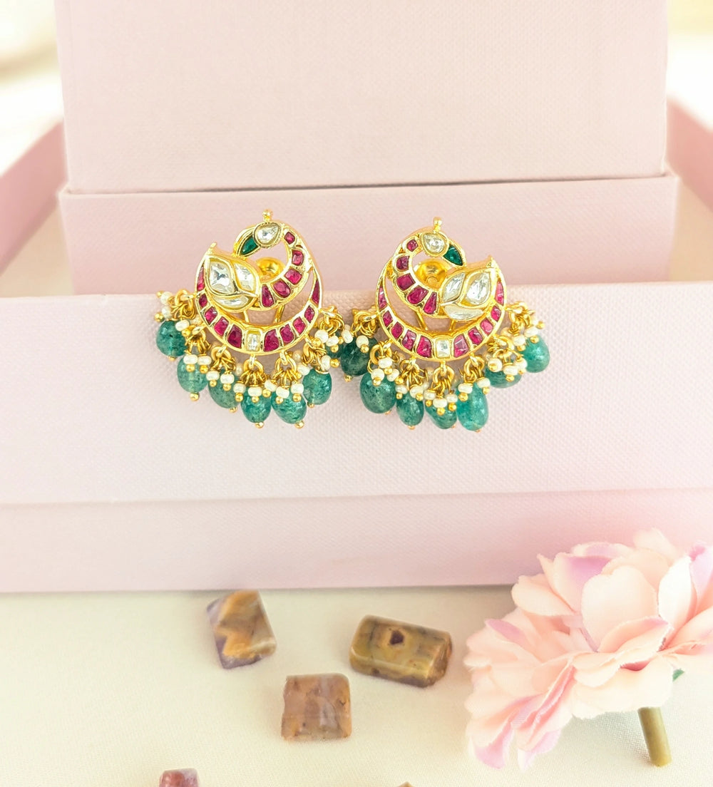 Jadau Kundan Peacock Studs with Pearl & Natural Strawberry Beads Price: ₹1,000 Elegant and vibrant, these Jadau...