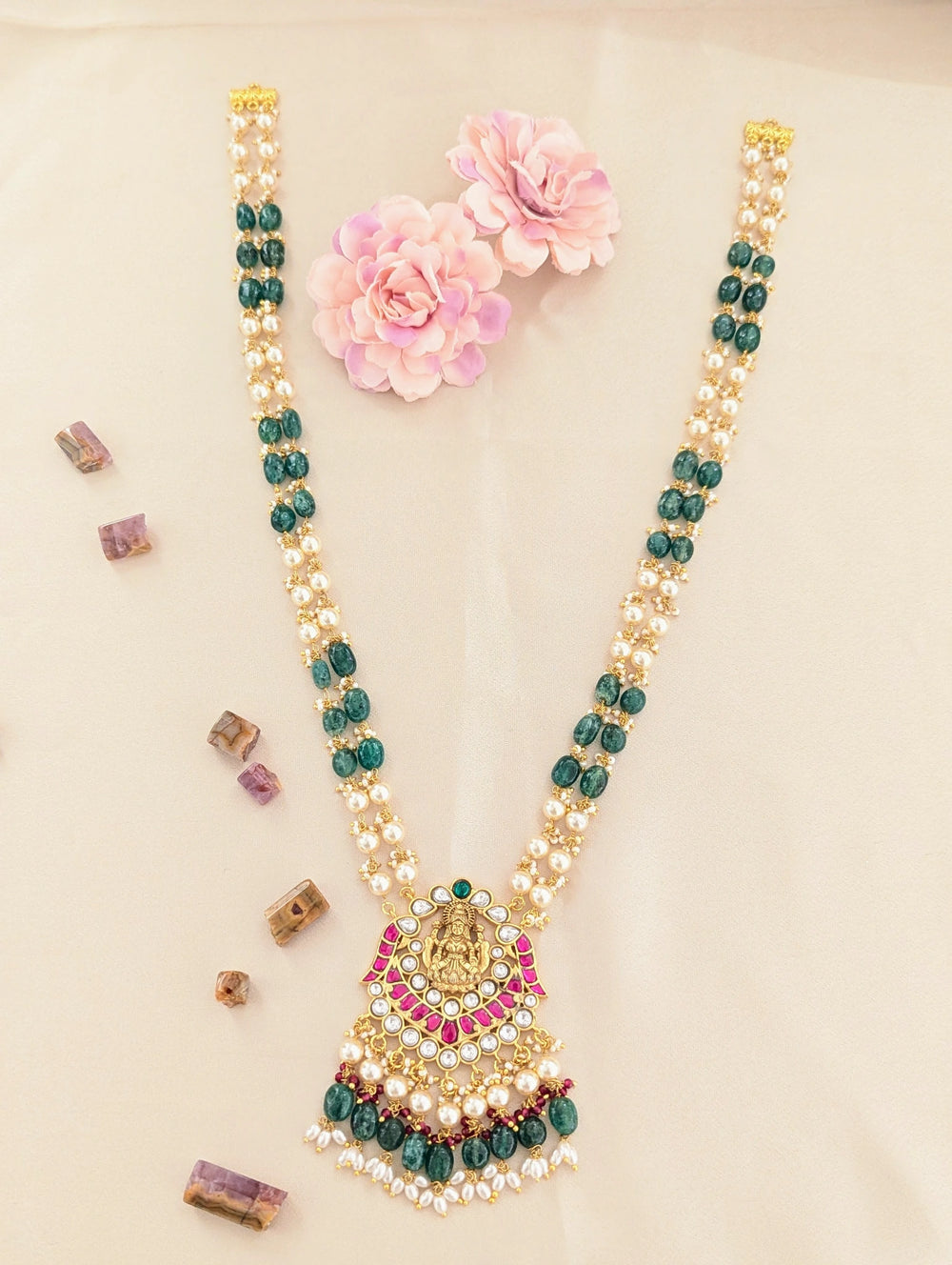 Jadau kundan pearls/Beads mala goddess laxmi pendant with natural strawberry