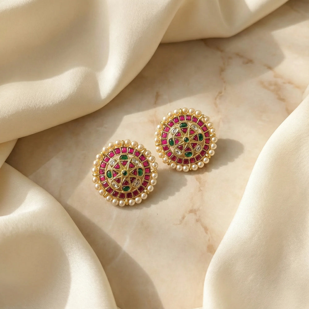 These Jadau Kundan Stud Earrings are a refined expression of traditional elegance, designed in a classic circular silhouette. Each stud is meticulously crafted in a gold-tone finish and set with kundan-style stones in rich ruby hues, accented with subtle green detailing at the center. A delicate border of pearl-like beads frames the design, adding softness and balance to the structured form.